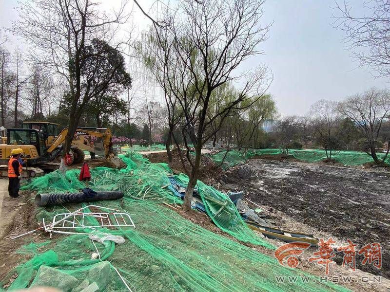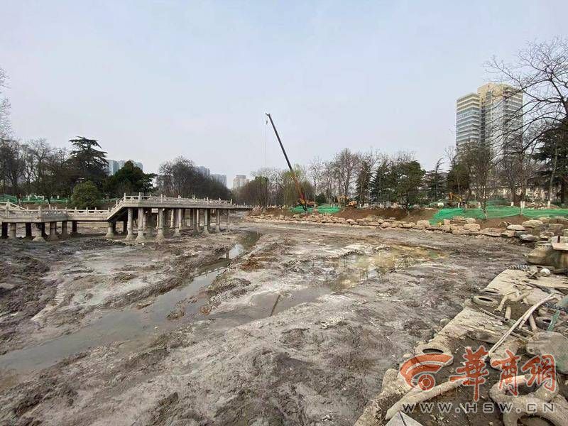 改造现场,兴庆湖的水已经全部抽干,只剩裸露在外的湖底淤泥。梁子斌介绍,对兴庆湖的改造主要包括水质提升和湖堤的改造。